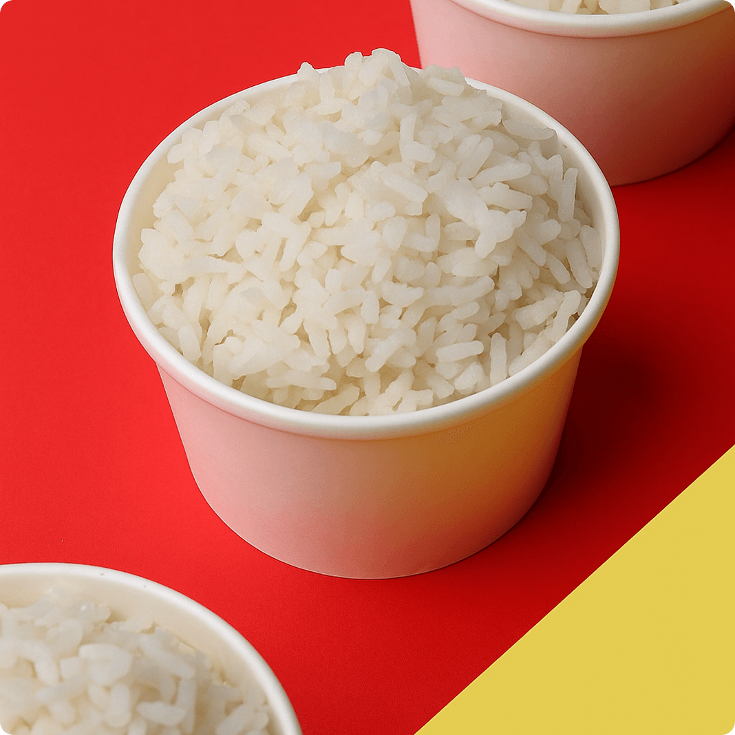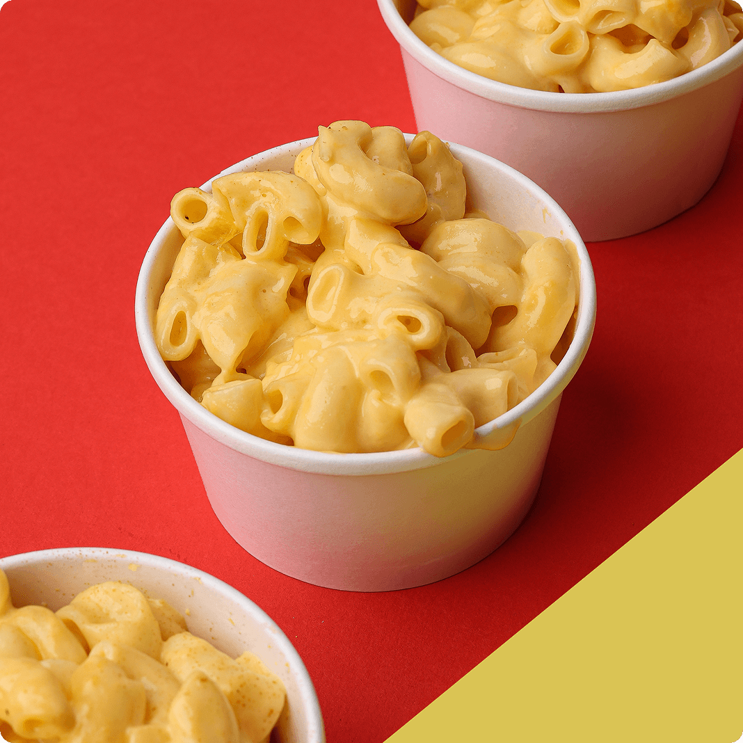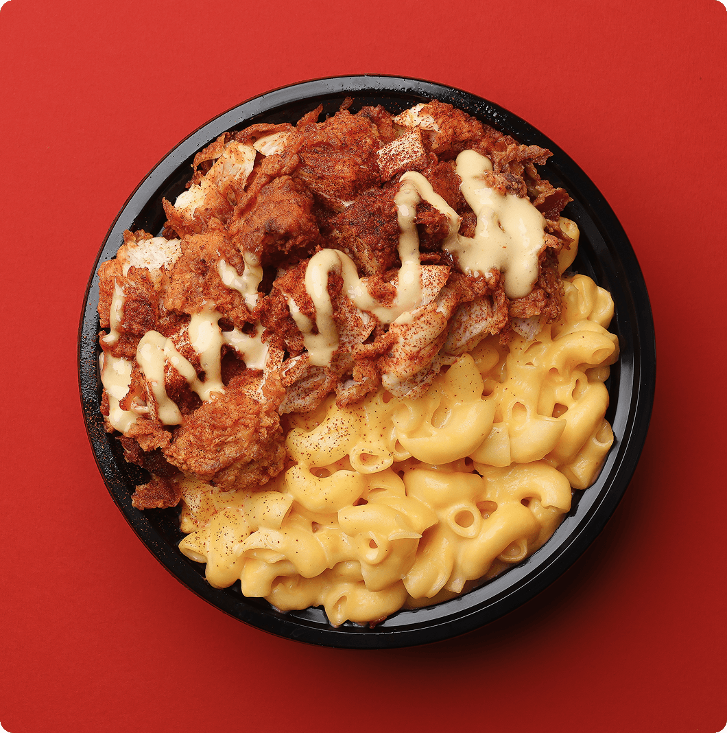 Tender chicken over fluffy rice, paired with creamy mac and cheese