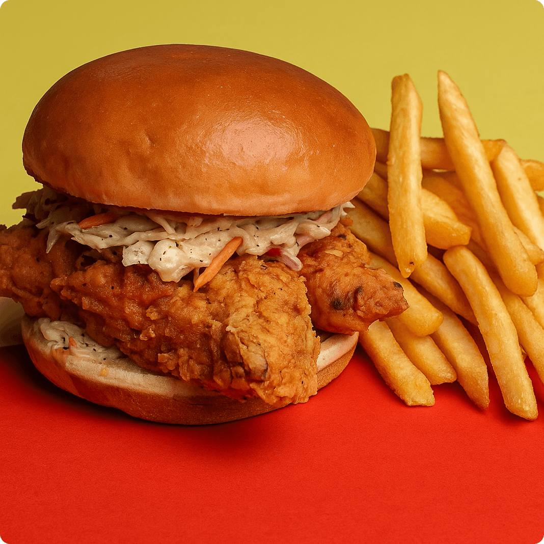 Chicken breast topped with coleslaw, pickles, and a soft bun, served with a side of fries