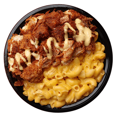 Tender chicken over fluffy rice, paired with creamy mac and cheese